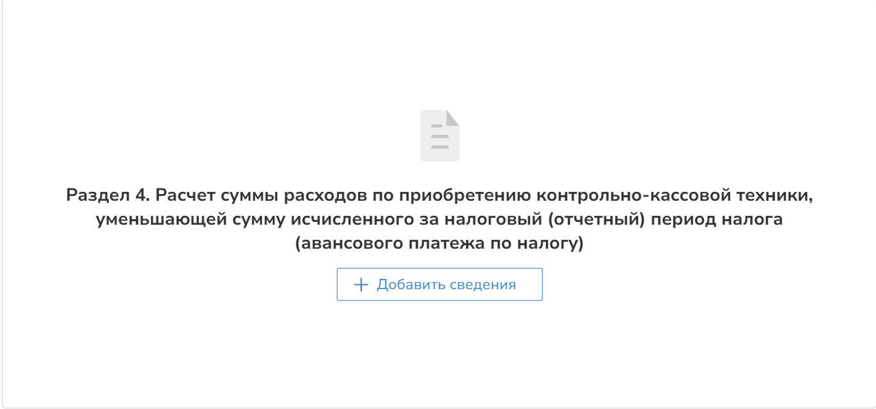 - Если вы работаете на новых территориях: добавьте раздел 4. Его заполняют налогоплательщики из новых регионов, которые претендуют на налоговый вычет по расходам на контрольно-кассовую технику (ККТ). Это ИП на УСН из ДНР, ЛНР, Запорожской или Херсонской области.