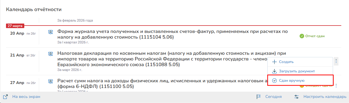 2. Напротив отчета в контекстном меню поставьте отметку о сдачи вручную