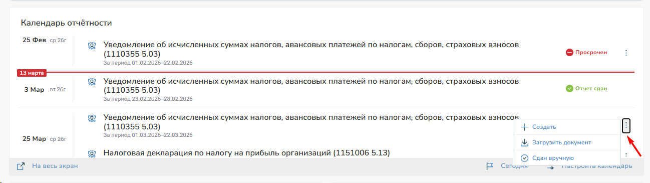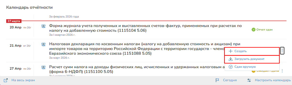 2. Напротив отчета в контекстном меню нажмите «Создать» или «Загрузить документ» (ранее экспортированный отчет из бухгалтеров программы)