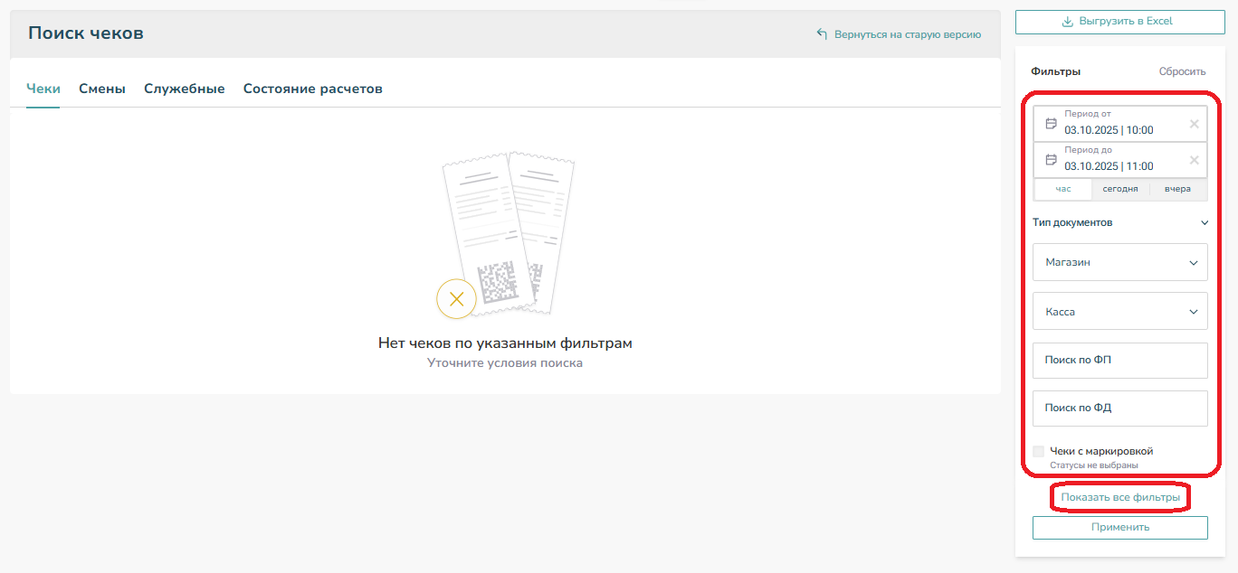 - Период времени – Выберите даты, соответствующие моменту пробития чека на кассе, с помощью календаря.
