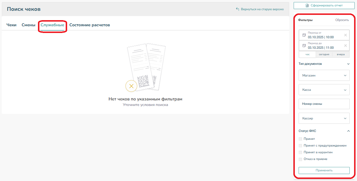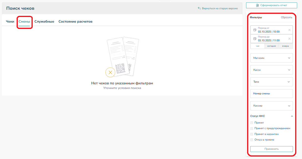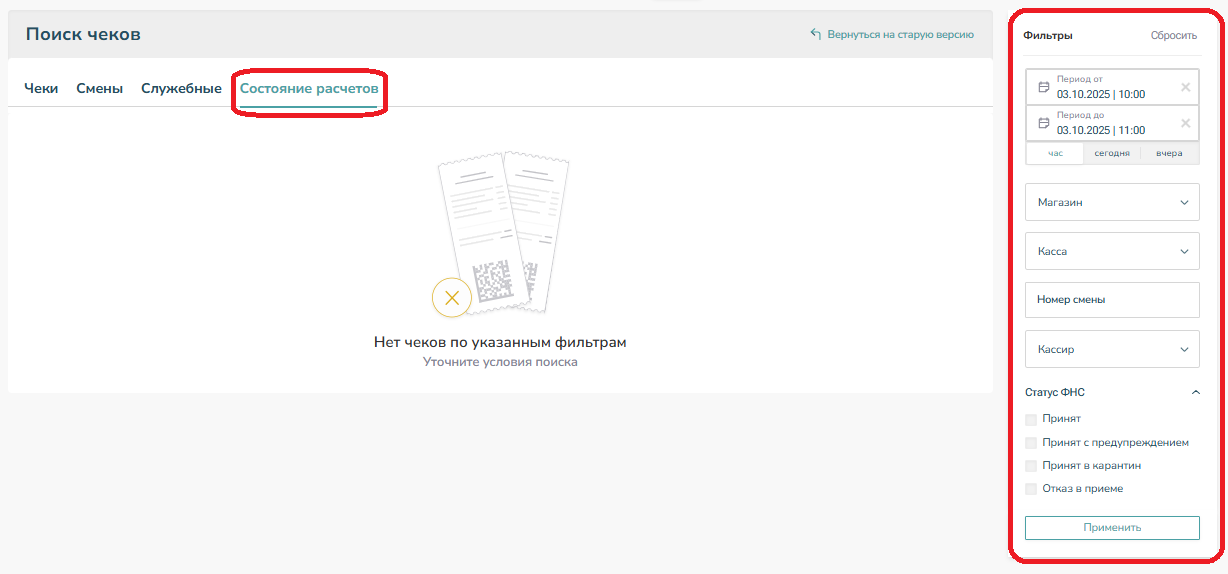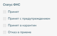 - Статус чека ФНС — выберите статус чека для просмотра результатов форматно-логического контроля.