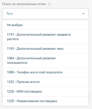 - Тег — поиск осуществляется по фискальным документам, в которых есть один из дополнительных тегов (1191, 1192, 1084, 1008, 1222, 1226, 1225). После выбора тега, появится поле «Содержание тега», в котором можно указать значение, чтобы найти только чеки, содержащие определенное значение тега.