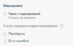 - Чеки с маркировкой — отметьте этот чекбокс для отображения чеков с маркированной продукцией.