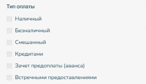 - Тип оплаты — укажите способ расчета и форму оплаты (наличными или безналичными).
