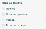 - Признак расчета — указывает на вид операции между покупателем и продавцом, отображая порядок движения денежных средств, передаваемый кассовым аппаратом в чеке:
