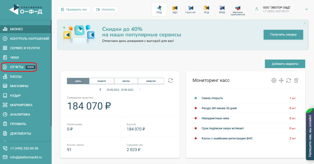 - В разделе отчеты, можно ознакомиться с тем, к каким отчетом у Вас есть доступ. Для примера мы возьмем один из самых популярных отчетов «Чеки»;