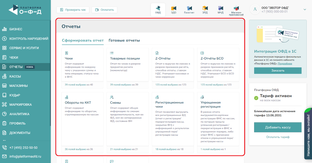 Данный отчет содержит информацию отдельно по каждому чеку с указанием суммы и типа операции, статуса чека в ФНС, тега 1191 (дополнительный идентификатор предмета расчёта), тега 1084 и прочей информации.