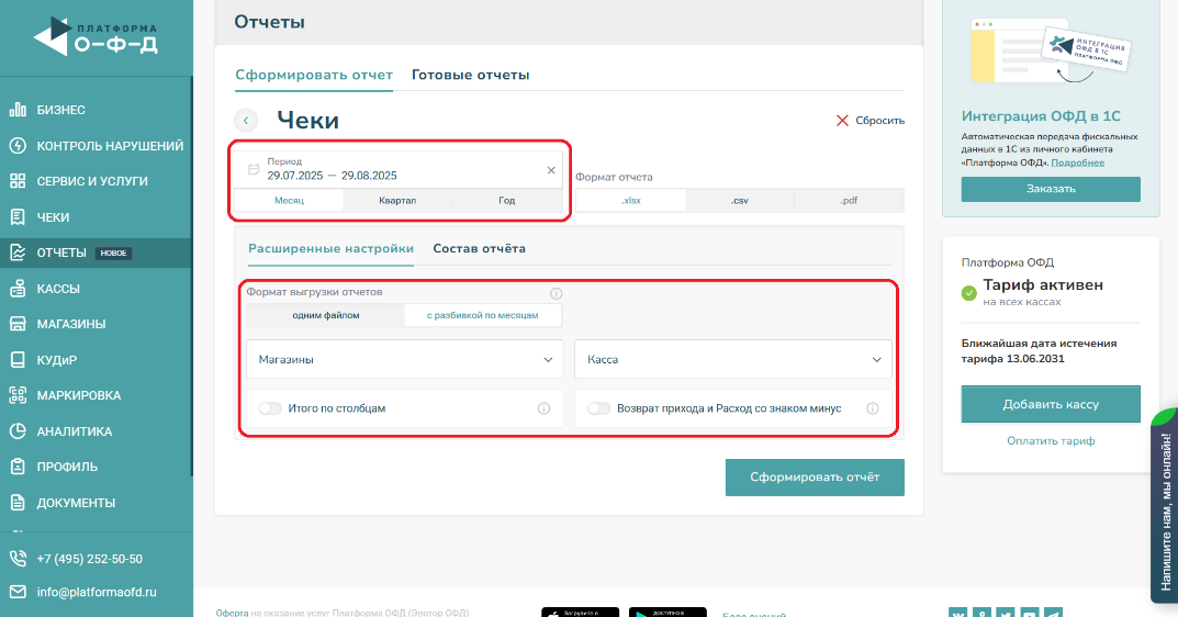 - Далее открывается окно с параметрами отчета, здесь можно редактировать дату, список касс, магазинов и т.д;