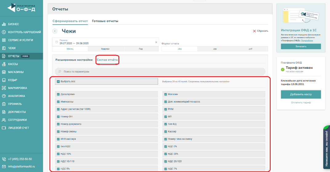 Отчет по чекам с маркировкой по ФФД 1.05 и 1.1.