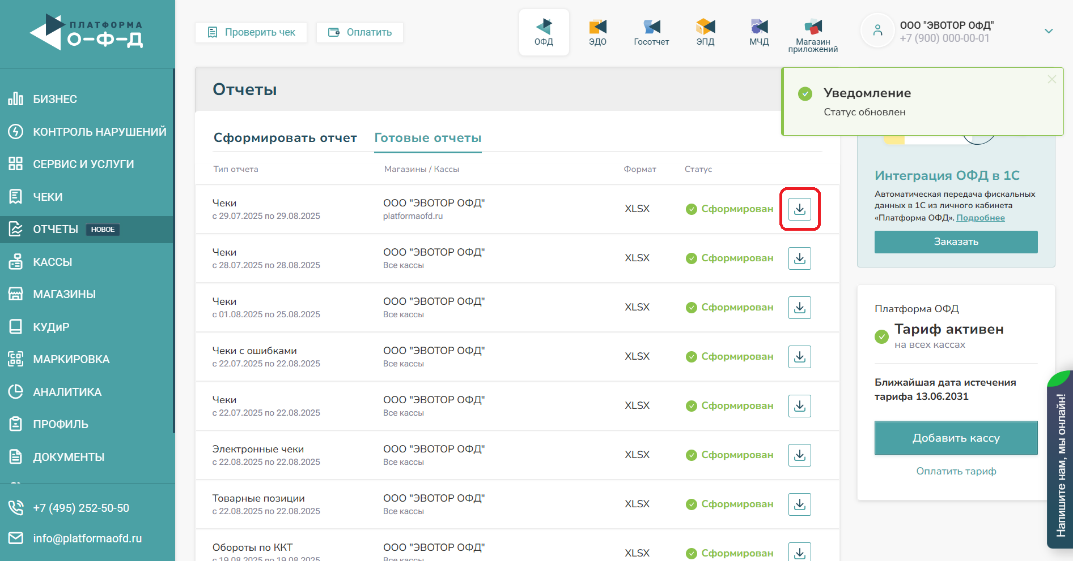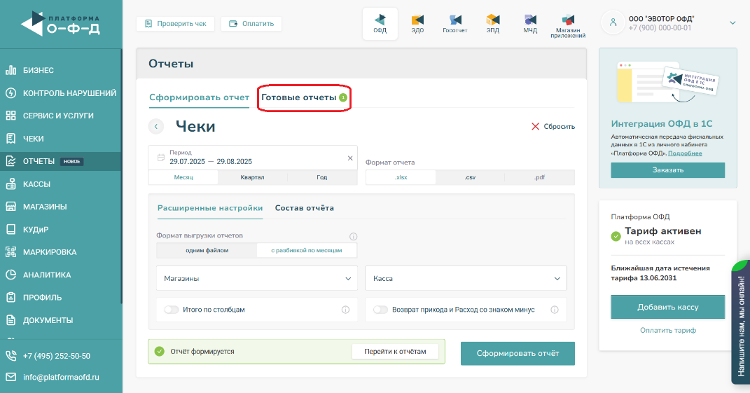 - Отчет попадет в очередь на формирование. Процесс формирования можно отследить во вкладке «Готовые отчеты»;