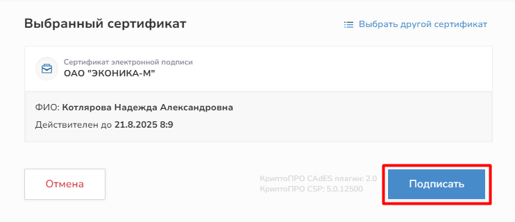5. В окне Выберите электронную подпись из списка и нажмите «Подписать»