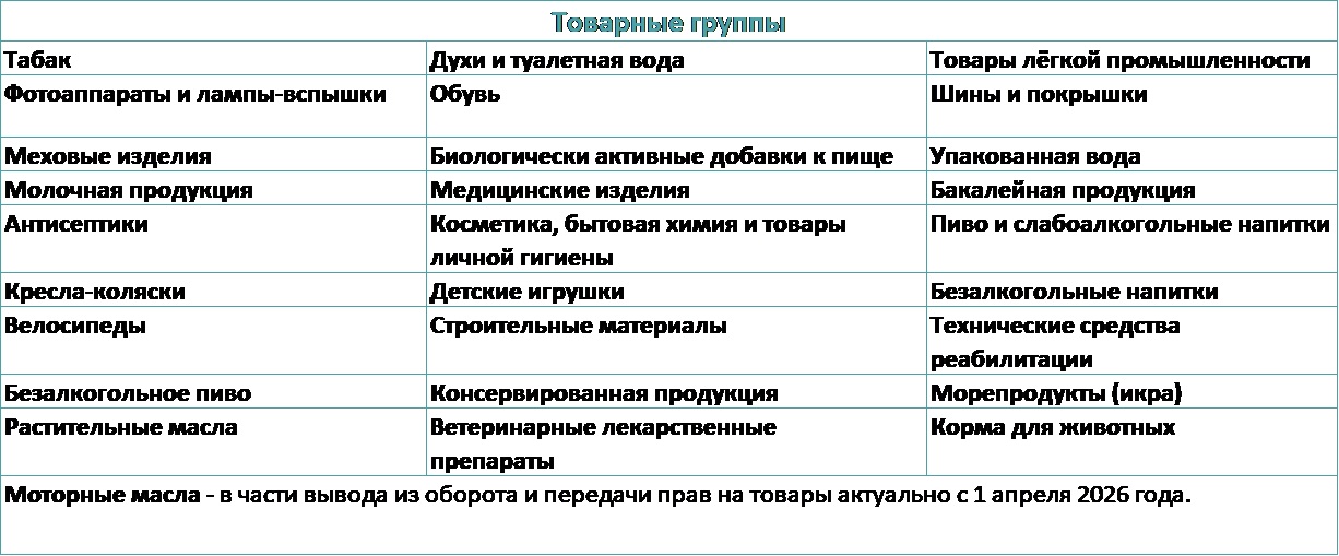 До 28 февраля 2026 г. (включительно) — все участники оборота должны промаркировать товарные остатки, не реализованные до 1 января 2026 г. и ввести в оборот до 28 февраля 2026 г. (включительно).